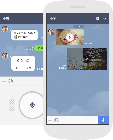 除了普通的文字信息、图片、定位信息以外, 您还可以传送自己录制的语音及视频文件。使用LINE,轻松分享!